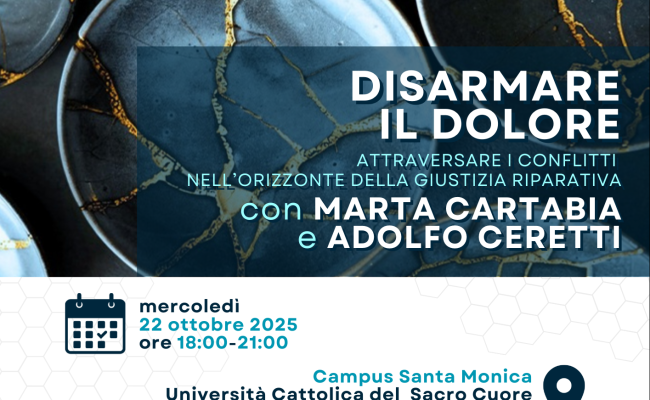 Nel pomeriggio di mercoledì 22 ottobre a Cremona, nell'aula magna del Campus Santa Monica dell’Università Cattolica del Sacro Cuore, interverranno sul tema "Disarmare il Dolore, attraversare i conflitti nell’orizzonte della giustizia riparativa" Marta Cartabia, ordinaria di Diritto costituzionale italiano ed europeo presso l’Università Bocconi, presidente emerito della Corte costituzionale ed ex ministro della Giustizia, e Adolfo Ceretti, ordinario di Criminologia e docente di Mediazione reo-vittima presso l’Università degli Studi di Milano-Bicocca, nonché segretario generale del Centro nazionale di prevenzione e difesa sociale. Leggi...