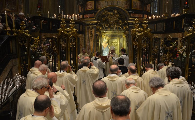 Dopo un breve momento di adorazione al Santissimo il presule si è diretto in sagrestia per assumere i paramenti sacri. Qui ha ritrovato mons. Ariotti, nunzio apostolico in Paraguay, particolarmente devoto del santuario e una ventina di sacerdoti delle zone prima e seconda della diocesi già pronti per concelebrare.