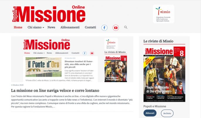 Con l’inizio del Mese missionario, la rivista “Popoli e Missione” è anche on line. Oggi, infatti, è stato inaugurato il sito che raccoglie tutte le pubblicazioni della Fondazione Missio, fornendo, di fatto, uno spazio ulteriore per le news da e sul mondo della missione ad gentes. “L’era digitale offre nuove e gigantesche opportunità comunicative, accanto a trappole come le fake news o l’infodemia. Con internet il mondo è diventato più piccolo, ma non meno complesso. Comunque siamo di fronte a una sfida da cogliere, anche nel mondo missionario. Per questa ragione la Fondazione Missio, assieme alla Redazione delle sue riviste, ha deciso di realizzare un sito apposito – www.popoliemissione.it – dedicato all’informazione missionaria, che si accosta al sito www.missioitalia.it per la comunicazione ‘ufficiale’ della stessa Fondazione”.