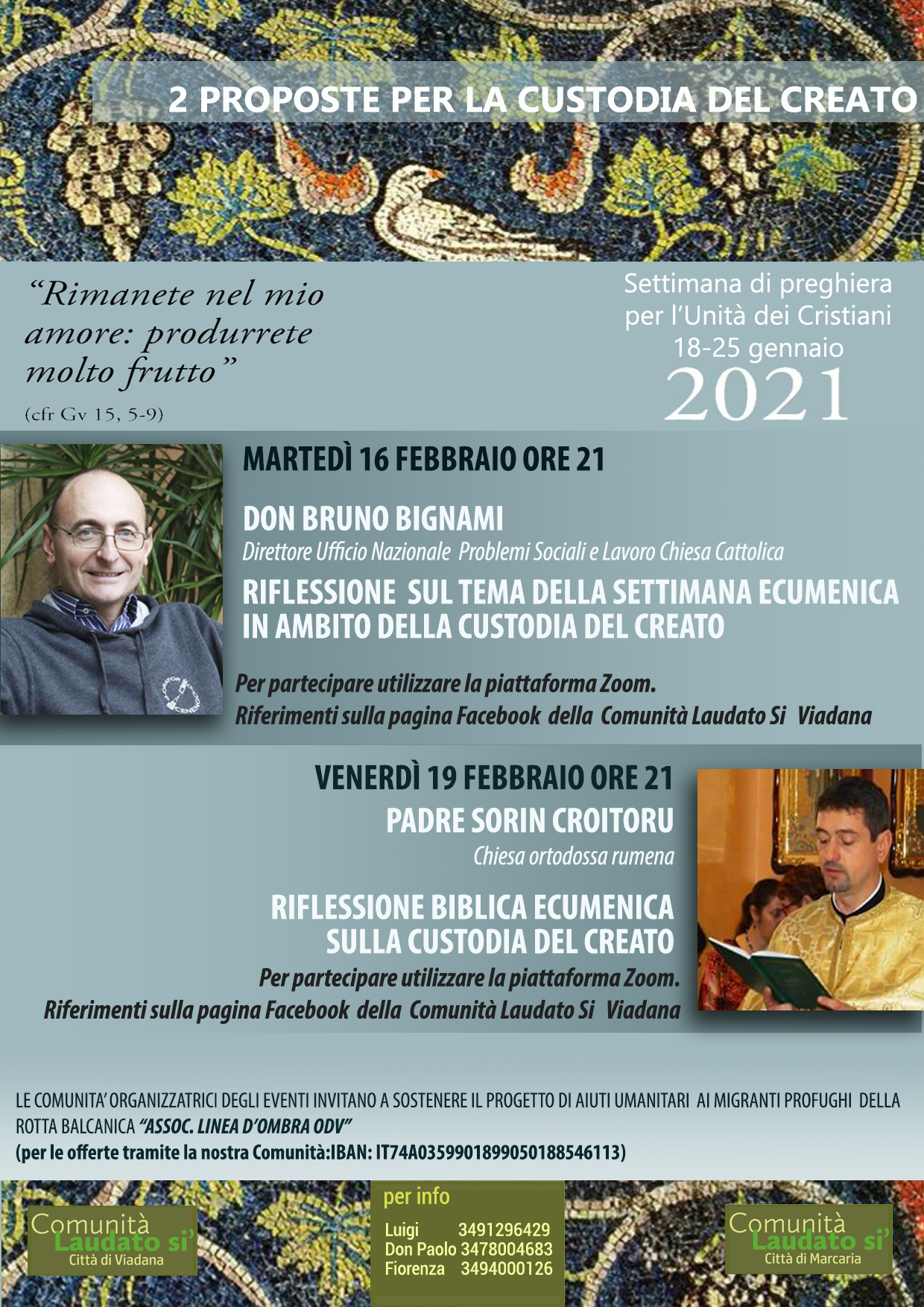 Entrambe le serate saranno proposte attraverso piattaforma Zoom: riferimenti sulla pagina facebook della “Comunità Laudato si’ Città di Viadana”.