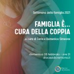 Domenica 28 febbraio alle 21 Domenico Simeone con la moglie Carla guarderanno alla cura di cui ha bisogno la coppia e a come questa dimensione viene vissuta in famiglia: quali i tempi e gli spazi, quali le provocazioni venute da questo periodo che ne ha sovvertito le ordinarie dinamiche.