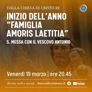Venerdì 19 marzo, solennità di san Giuseppe, inizia l’Anno Famiglia Amoris laetitia, un’iniziativa che coinvolge le Chiese di tutto il mondo a cinque anni dalla pubblicazione dell’esortazione apostolica postsinodale Amoris laetitia, di papa Francesco. Nell’occasione il vescovo Antonio Napolioni alle ore 20.45 nella chiesa parrocchiale di Cristo Re, a Cremona, presiederà l’Eucaristia. Inizierà dunque con la preghiera quest’anno dedicato alle famiglie.
