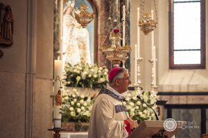 «Insieme al vescovo Dante siamo qui con letizia, in questo santuario dedicato a Maria Madre della Misericordia per condividere con tutti voi il grazie a Maria, l’affidamento, la gioia della fede e l’intercessione per le pene e le speranze che riempiono il cuore di tante famiglie. Non abbiamo ancora potuto fare la solenne processione ma la chiesa non è vuota come lo scorso anno e questo è un segno che dei primi passi, accompagnati dalla Madonna, si stanno facendo», ha esordito monsignor Napolioni di fronte ai fedeli presenti.
