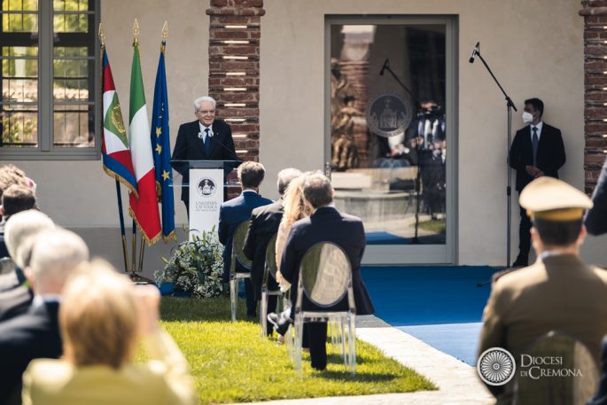 La storia – ha sottolineato il capo dello Stato – è raccolta e ricordata «qui, tra la Cattedrale, il Torrazzo, il Battistero, il Palazzo municipale, la Loggia dei Militi». E guarda ora, dopo la «tragedia della pandemia che ha seminato dolore e lutti», a un futuro di ripartenza al cui centro si pone la fiducia nelle nuove generazioni, di cui proprio l’università è segno. A loro, agli studenti, «veri padroni di casa», Mattarella ha rivolto un saluto «intenso e particolare» aprendo il suo discorso nel chiostro dell’ex monastero di Santa Monica splendidamente recuperato: «Un monastero… – ha sottolineato – I monasteri nell’Alto Medioevo furono i propulsori della rinascita culturale e civile dei popoli d’Europa. Siamo in un momento di ripresa per il nostro Paese; essere qui in un monastero assume quasi un valore simbolico».