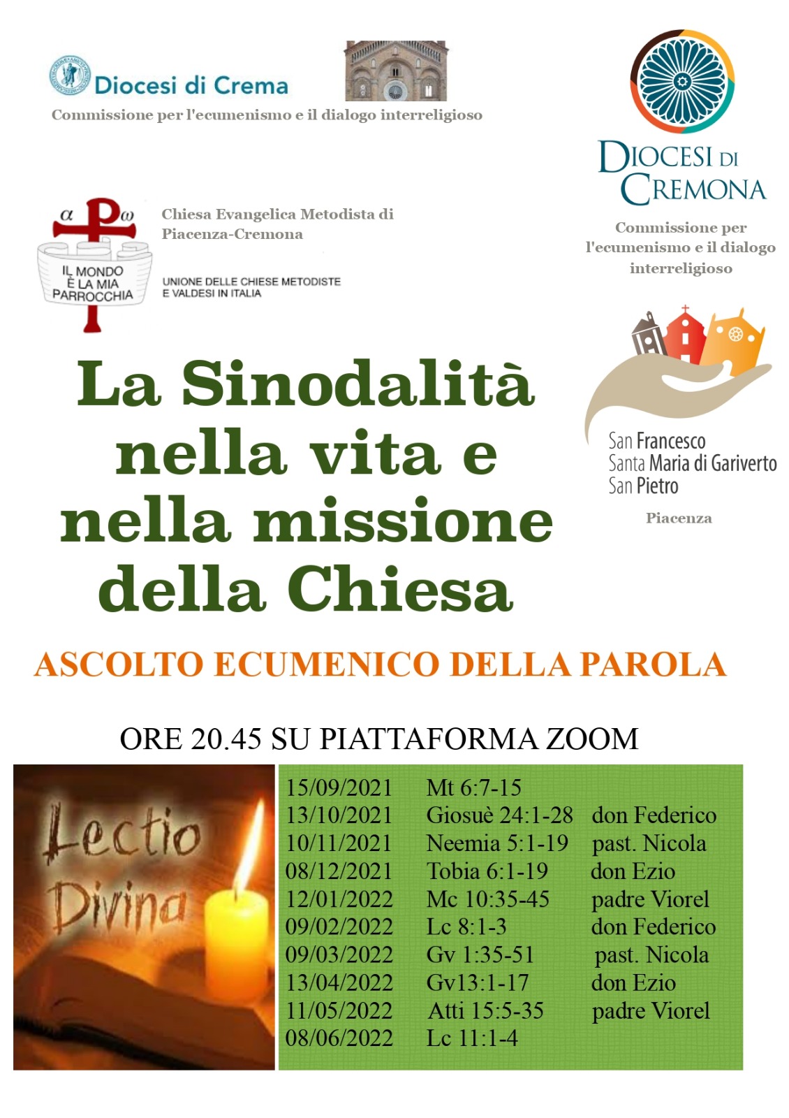 Proposti e guidati dal pastore Metodista di Cremona e Piacenza Nicola Tedoldi, da don Ezio Molinari di Piacenza, da padre Viorel Flestea della Chiesa Romena Grecocattolica di Crema e da don Federico Celini, incaricato per la Pastorale ecumenica e il Dialogo interreligioso della Diocesi di Cremona, gli incontri sono aperti a tutti coloro che desiderino vivere una autentica e profonda esperienza ecumenica, fondata sulla Parola di Dio.
