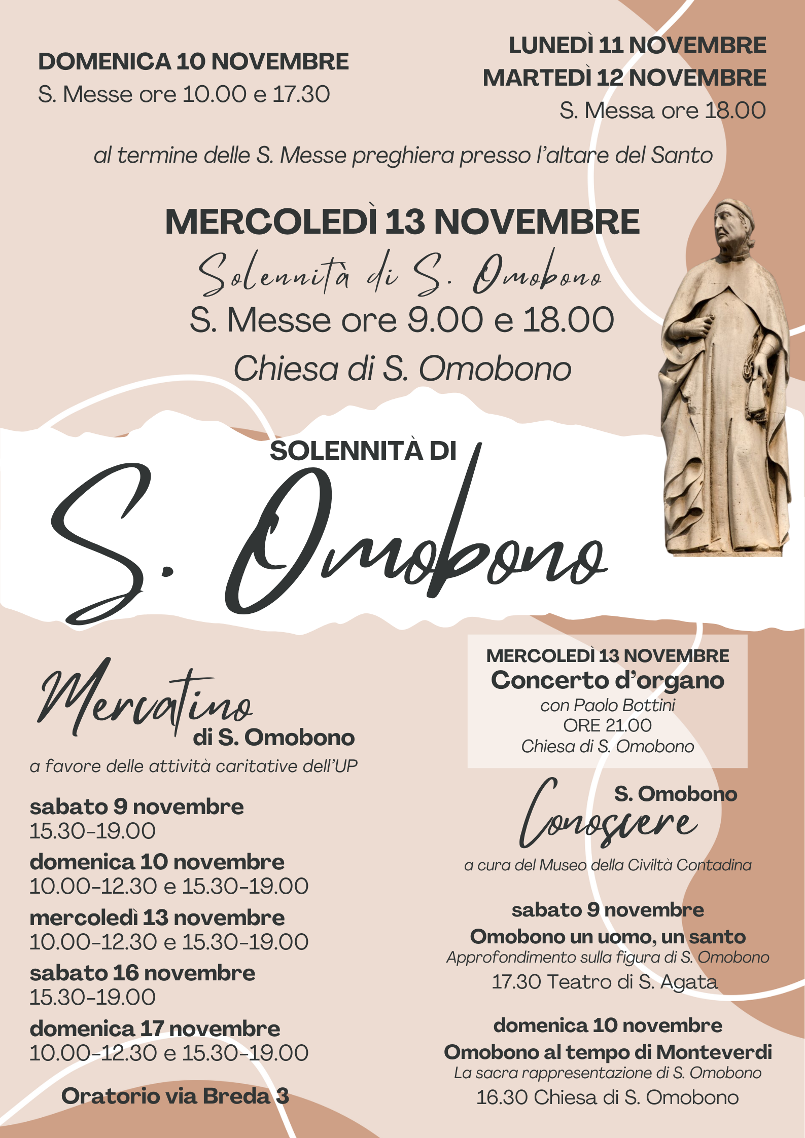 Nell’ambito della festa patronale di sant’Omobono, nell’omonima chiesa che si affaccia su via Ruggero Manna, a Cremona, in quella che fu la chiesa frequentata dal Santo e dove fu in un primo tempo tumulato, oggi chiesa sussidiaria della parrocchia “Ss. Giacomo e Agostino” nell’unità pastorale Cittanova, sono in programma diversi momenti di carattere liturgico per onorare il patrono della città e della Diocesi.