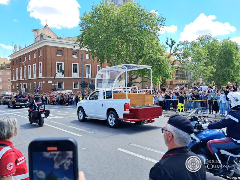 Da San Pietro a Santa Maria Maggiore. E’ lungo sei chilometri il 48° e ultimo viaggio di Papa Francesco, il primo papa del ventunesimo secolo che nel suo testamento ha espresso la volontà di essere sepolto in un luogo diverso dalla basilica vaticana. A bordo di un carro funebre davvero singolare, una ex papamobile già usata in un viaggio in Oriente e riadattata in modo tale da poter essere aperta e visibile lungo tutto il tragitto dalla Porta del Perugino al luogo della sepoltura, il Pontefice che fin dall’affaccio alla Loggia delle benedizioni amava definirsi “vescovo di Roma” ha ricevuto dalla sua Roma – oggi più che mai “caput mundi” – un abbraccio infinito che dagli oltre 250mila fedeli presenti ai funerali si è dilatato da piazza San Pietro in tutti i luoghi più simbolici del centro storico, grazie ad un corteo a passo d’uomo che partendo dalla Porta del Perugino e attraversando la Galleria Pasa, ha percorso Corso Vittorio Emanuele per poi arrivare a piazza Venezia e svoltare sui Fori imperiali, proseguendo per via Labicana e via Merulana. Tutti coloro che fin dalle prime ore del mattino si sono accalcati lungo le transenne hanno potuto così salutare il primo papa argentino della storia. L’inizio e la fine del pontificato si richiamano a vicenda, allo stesso modo in cui la presenza dell’icona della Madonna Salus Populi, in copia in piazza San Pietro e in originale a Santa Maria Maggiore, ha unito idealmente il funerale in piazza e la tumulazione nella Basilica Liberiana, dove il feretro di Papa Francesco è stato accolto da circa 40 poveri scelti dalla Caritas. Tra i momenti più commoventi del rito funebre, quello avvenuto prima e dopo l’aspersione della bara con l’acqua benedetta: anche durante il funerale di Bergoglio, come era già avvenuto vent’anni fa durante il funerale di Giovanni Paolo II, il vento ha aperto e fatto sfogliare le pagine del Vangelo collocato, come di prassi, sopra la bara del Pontefice defunto.