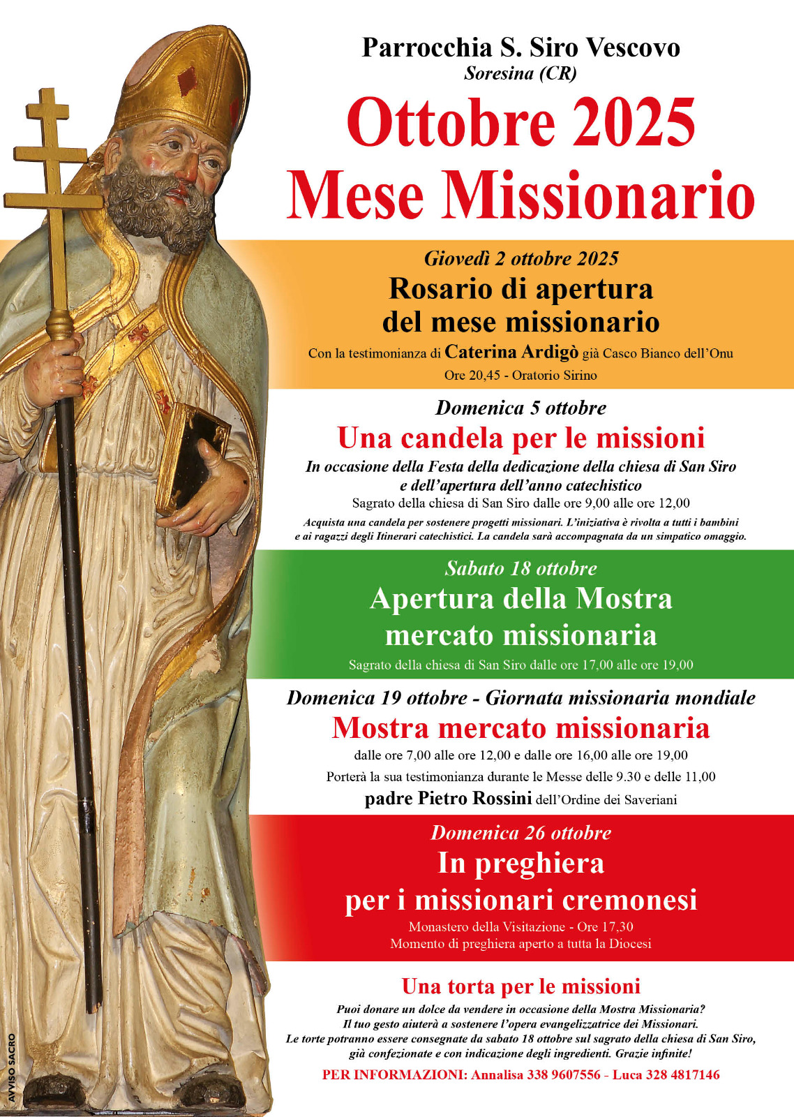 Sabato 18 ottobre, a partire dalle 17, aprirà la mostra-mercato con oggetti realizzati in terra di missione, torte, dolci, piante grasse, oggetti natalizi e tanto altro ancora. La Mostra mercato rimarrà aperta anche tutta la giornata di domenica 19 ottobre, dalle 7 alle 12 e dalle 16 alle 19. Sempre domenica 19 ottobre, le Messe delle 9.30 e delle 11 saranno presiedute da padre Pietro Rossini, missionario saveriano che porterà la sua personale esperienza e testimonierà lo spirito della missionarietà Saveriana.