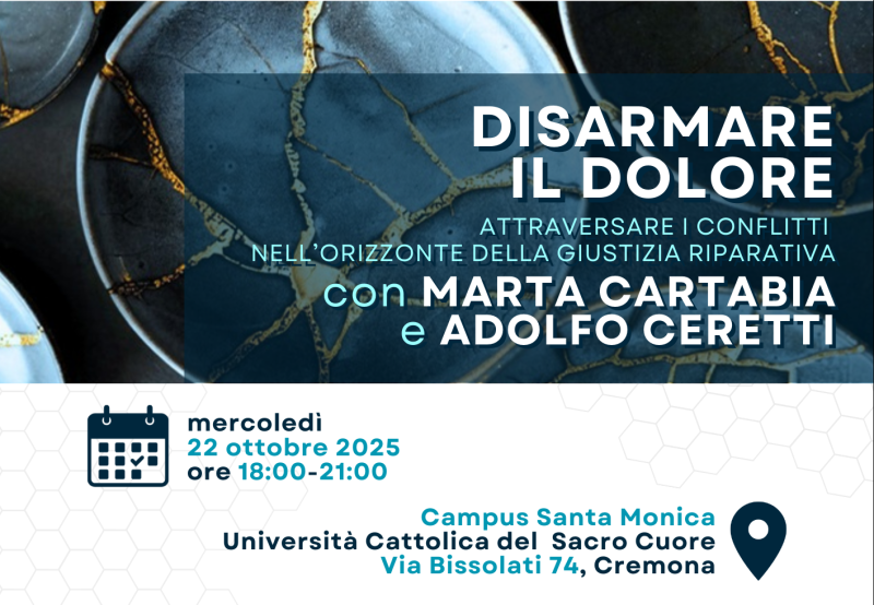 Nel pomeriggio di mercoledì 22 ottobre a Cremona, nell’aula magna del Campus Santa Monica dell’Università Cattolica del Sacro Cuore, interverranno sul tema “Disarmare il Dolore, attraversare i conflitti nell’orizzonte della giustizia riparativa” Marta Cartabia, ordinaria di Diritto costituzionale italiano ed europeo presso l’Università Bocconi, presidente emerito della Corte costituzionale ed ex ministro della Giustizia, e Adolfo Ceretti, ordinario di Criminologia e docente di Mediazione reo-vittima presso l’Università degli Studi di Milano-Bicocca, nonché segretario generale del Centro nazionale di prevenzione e difesa sociale. L’incontro (ore 18), aperto alla cittadinanza previa iscrizione entro il 10 ottobre attraverso il link https://forms.gle/zoZSC5qnMcNnvn2C7, sarà moderato da Francesco Centonze, ordinario di Diritto penale presso la Facoltà di Economia e Giurisprudenza dell’Università Cattolica.