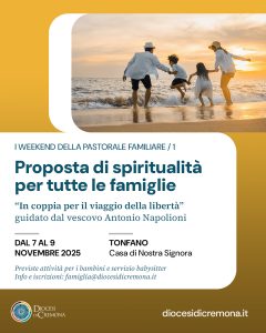 Il fine settimana dal 7 al 9 novembre – dal titolo “In coppia per il viaggio della libertà – è rivolto a tutte le famiglie e sarà un weekend di spiritualità guidato dal vescovo Antonio Napolioni.