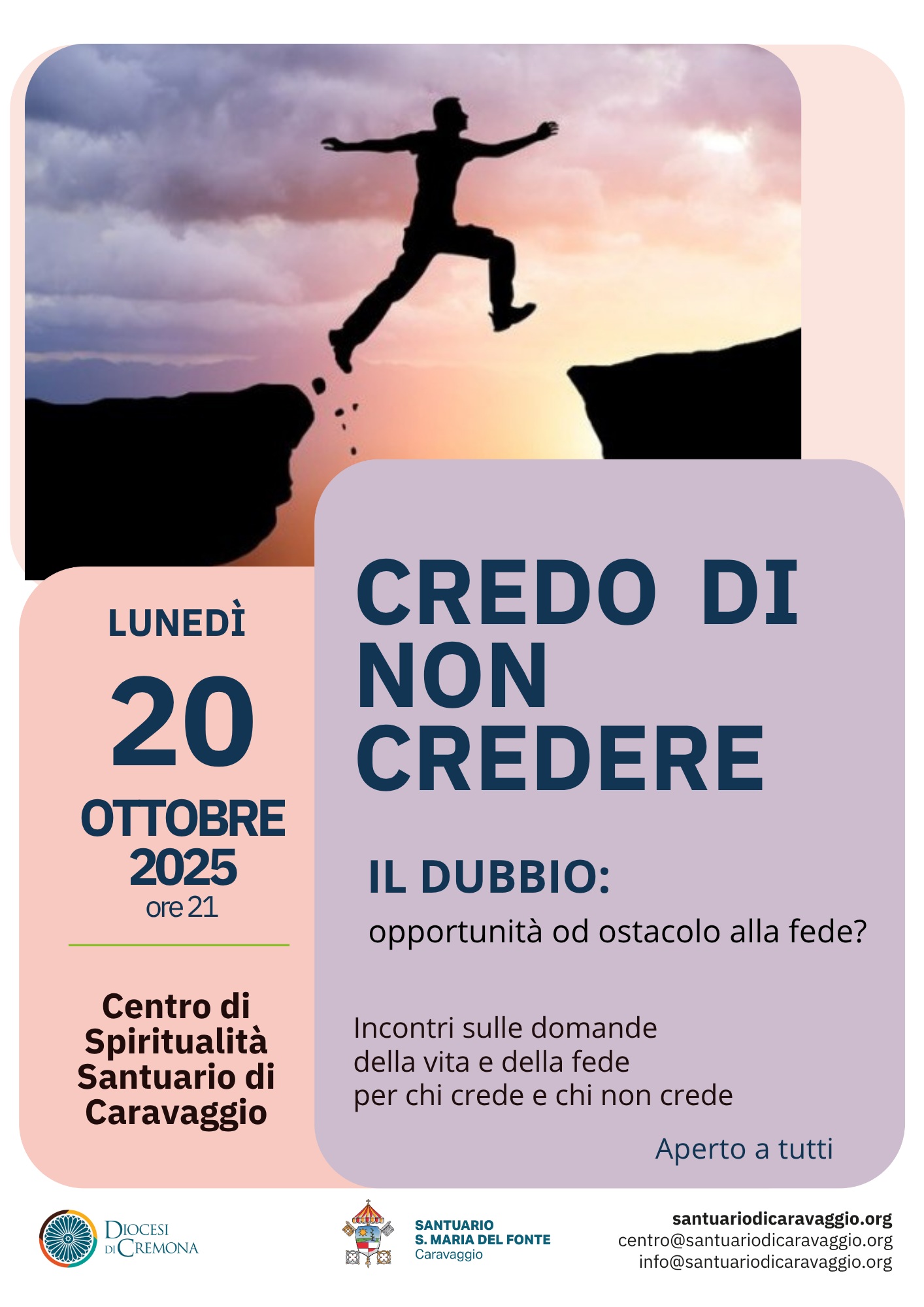 In questa consapevolezza riparte al Santuario di Caravaggio la proposta, già attiva da alcuni anni, di un percorso, aperto a tutti, dove ci si confronterà tra chi crede e chi non crede, alla scoperta che il dubbio e la perplessità non sono un ostacolo, ma uno slancio per approfondire e condividere un cammino di crescita umana e spirituale, sapendo accogliere le proprie fragilità.