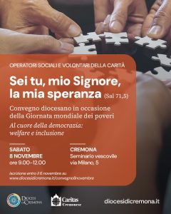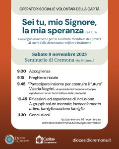 «Nel suo primo messaggio per la IX Giornata mondiale dei poveri – evidenziano da Caritas Cremonese – Papa Leone XIV ci ricorda che i poveri sono al centro dell’intera opera pastorale della Chiesa. I poveri non sono semplicemente i “destinatari” della carità ma “i fratelli e le sorelle più amati della Chiesa”, “soggetti creativi” che provocano tutti a trovare oggi nuove forme per vivere il Vangelo. “Aiutare il povero” è questione di giustizia e tutte le forme di povertà, nessuna esclusa, sono una chiamata a vivere con concretezza il Vangelo e ad offrire segni efficaci di speranza. “Sei tu, mio Signore, la mia speranza” (dal Salmo 71) è un’espressione che nasce da un cuore provato ma saldo nella fede, che riconosce in Dio la vera roccia e l’unico rifugio. In mezzo alle angosce, il salmista è certo che la speranza in Dio non delude». E ancora: «La Giornata mondiale dei poveri è anche un’occasione per ringraziare il Signore delle tante persone che dedicano gran parte del loro tempo all’ascolto e al sostegno di chi vive momenti di fatica. A fondamento delle tante iniziative concrete che si potranno realizzare in questa Giornata ci sia sempre la preghiera».