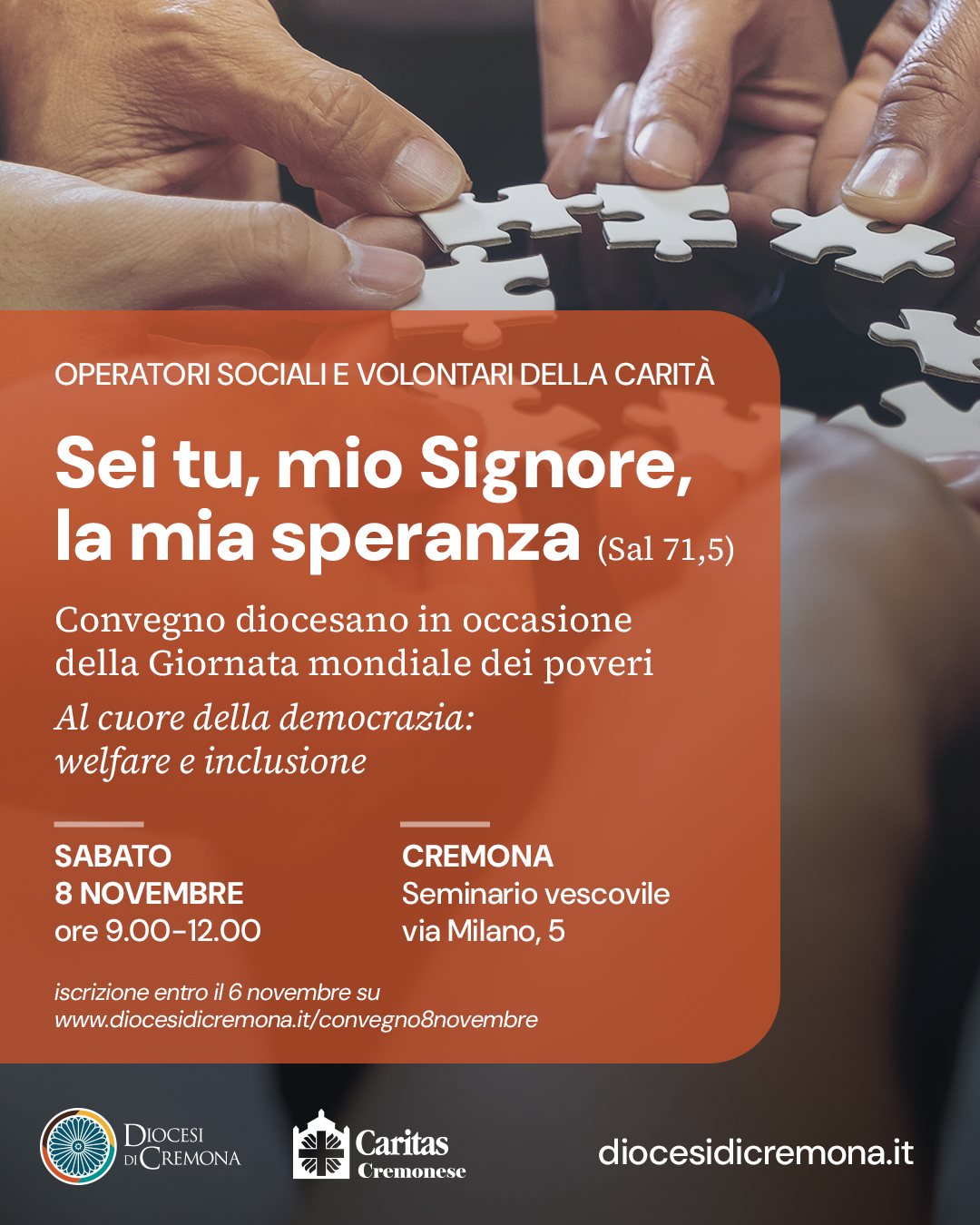 Per la partecipazione al convegno è necessario effettuare l’iscrizione (entro giovedì 6 novembre) al seguente link: www.diocesidicremona.it/convegno8novembre.