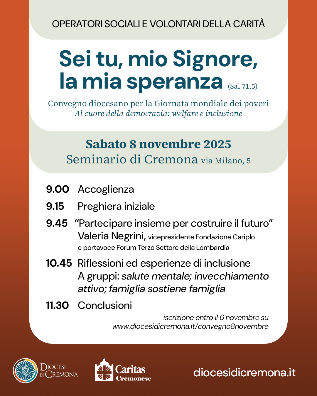 Alle 11.30 i partecipanti si riuniranno nuovamente per le conclusioni del convegno che, dal titolo “Al cuore della democrazia: welfare e inclusione”, con un chiaro riferimento alla 50ª Settimana sociale dei cattolici italiani che si è svolta a Triste nell’estate del 2024, prepara alla Giornata mondiale dei poveri 2025 sul tema “Sei tu, mio Signore, la mia speranza (Sal 71,5)”.