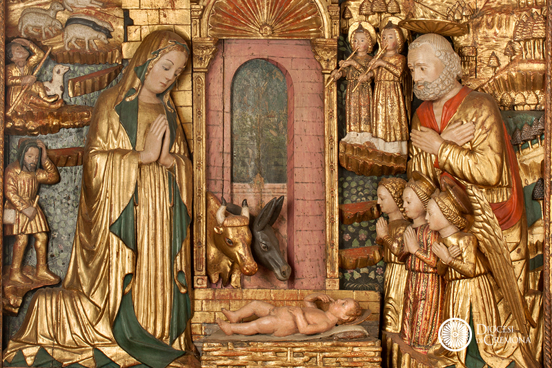 Si tratta di una rara ancona lignea, realizzata nel 1480 da Bongiovanni de’ Lupi, che consente di riscoprire una forma antica di narrazione del mistero della Natività, quando la fede prendeva corpo nel legno intagliato e nel colore dorato.