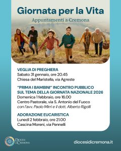 Domenica 1 febbraio ricorre la 48ª Giornata nazionale per la Vita, quest’anno incentrata sul tema “Prima i bambini!”. Una ricorrenza al centro dell’attenzione anche in diocesi di Cremona, con diverse iniziative in programma a Cremona tra momenti di preghiera e occasioni di riflessione e approfondimento. Il programma, coordinato dalla Zona pastorale 3 della Diocesi di Cremona, è promosso in sinergia con le realtà, gruppi e associazioni che sul territorio sono impegnati a favore e a tutela della Vita: tra questi in particolare il Movimento per la Vita e il Centro di aiuto alla Vita, insieme anche all’Ufficio di Pastorale familiare della Diocesi.
