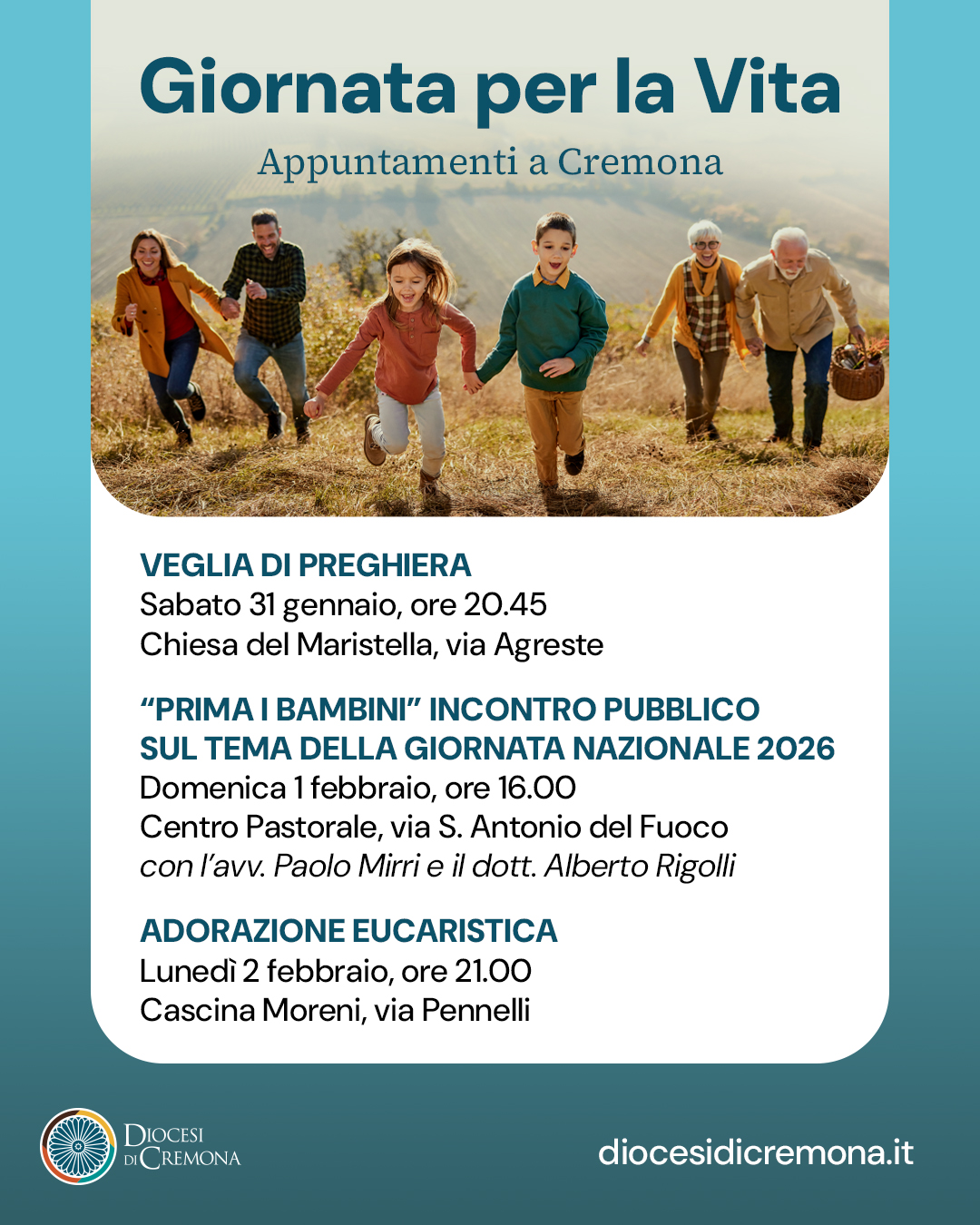Domenica 1 febbraio ricorre la 48ª Giornata nazionale per la Vita, quest’anno incentrata sul tema “Prima i bambini!”. Una ricorrenza al centro dell’attenzione anche in diocesi di Cremona, con diverse iniziative in programma a Cremona tra momenti di preghiera e occasioni di riflessione e approfondimento. Il programma, coordinato dalla Zona pastorale 3 della Diocesi di Cremona, è promosso in sinergia con le realtà, gruppi e associazioni che sul territorio sono impegnati a favore e a tutela della Vita: tra questi in particolare il Movimento per la Vita e il Centro di aiuto alla Vita, insieme anche all’Ufficio di Pastorale familiare della Diocesi.