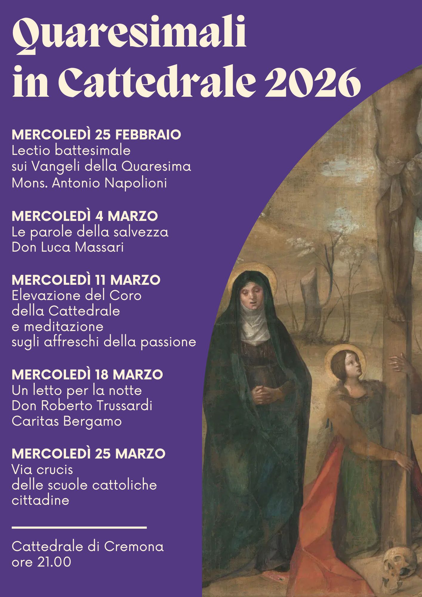 Mercoledì 11 marzo saranno invece la musica e l’arte a guidare nella preghiera i partecipanti, grazie all’elevazione musicale proposta dal Coro della Cattedrale di Cremona e accompagnata dalla meditazione del rettore, mons. Gianluca Gaiardi, sugli affreschi della navata centrale incentrati sulla Passione di Cristo.