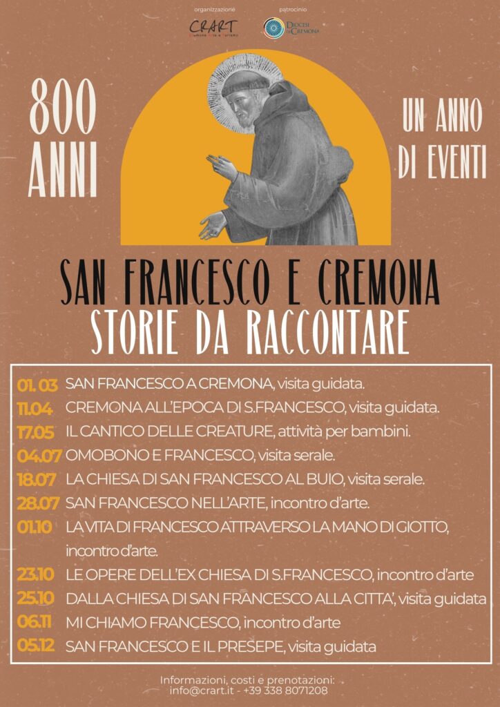 Gli appuntamenti partiranno domenica 1 marzo con una visita guidata alla scoperta della presenza di san Francesco a Cremona e termineranno a dicembre con una visita guidata dedicata a Francesco e il presepe.