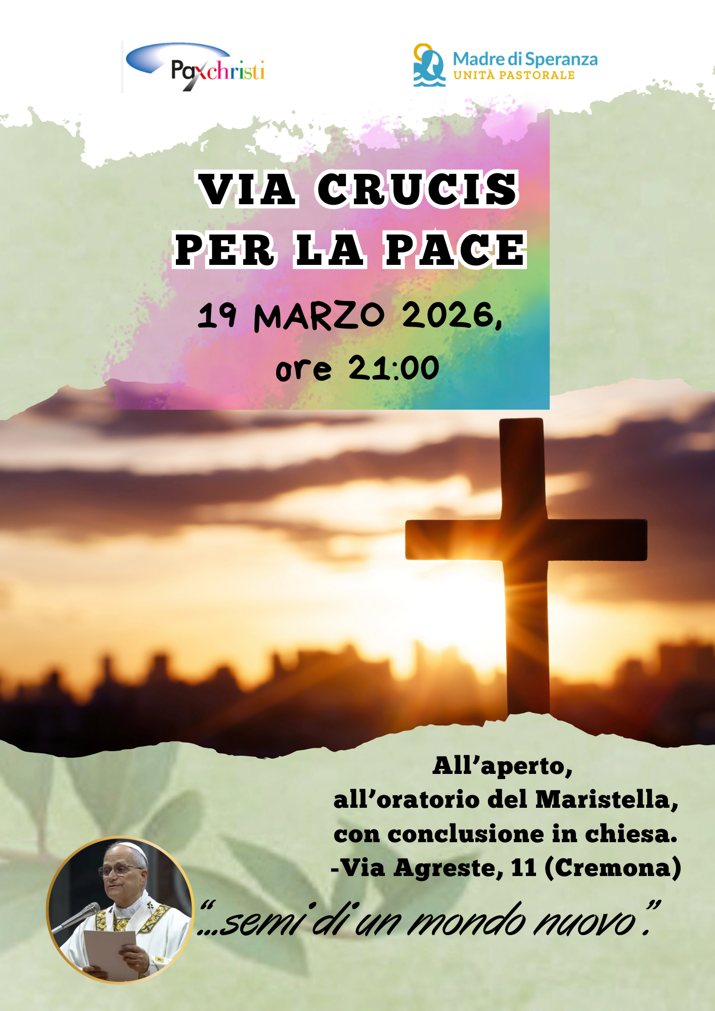 “Semi di un mondo nuovo”. Questo il tema che caratterizzerà la Via Crucis per la Pace in programma nella serata di giovedì 19 marzo, alle ore 21, a Cremona, presso la parrocchia del Maristela. L’iniziativa, promossa anche quest’anno da Pax Christi insieme all’unita pastorale Madre di Speranza, si svolgerà negli spazi esterni dell’oratorio del Maristella per poi concludersi all’interno della chiesa parrocchiale.