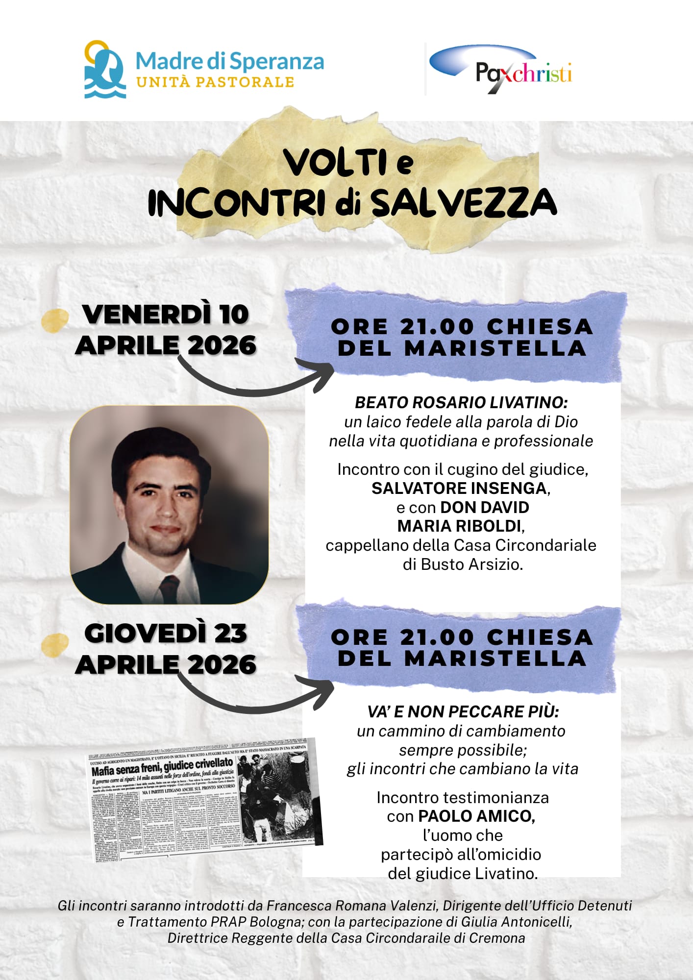 Per il periodo post-pasquale, Pax Christi Cremona e l’Unità pastorale “Madre di Speranza” di Cremona organizzano presso la parrocchia del Maristella due incontri – dal titolo “Volti e incontri di salvezza” – riguardanti la figura del beato Rosaio Livatino, martire della giustizia e testimone luminoso di fede.